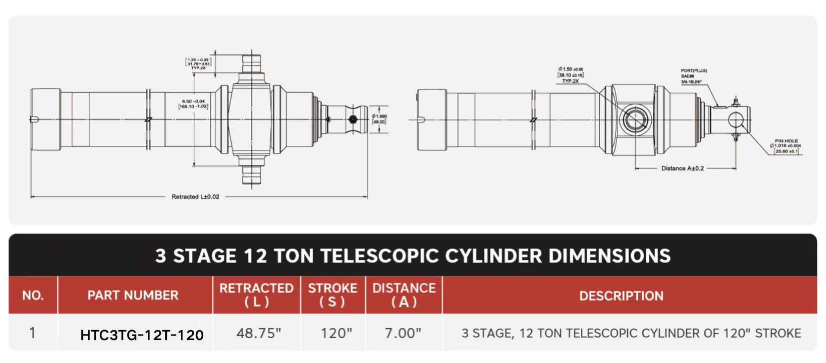 „HTC3TG-12T-120“, 3 pakopų, 12 tonų 120 colių eigos teleskopiniai cilindrai