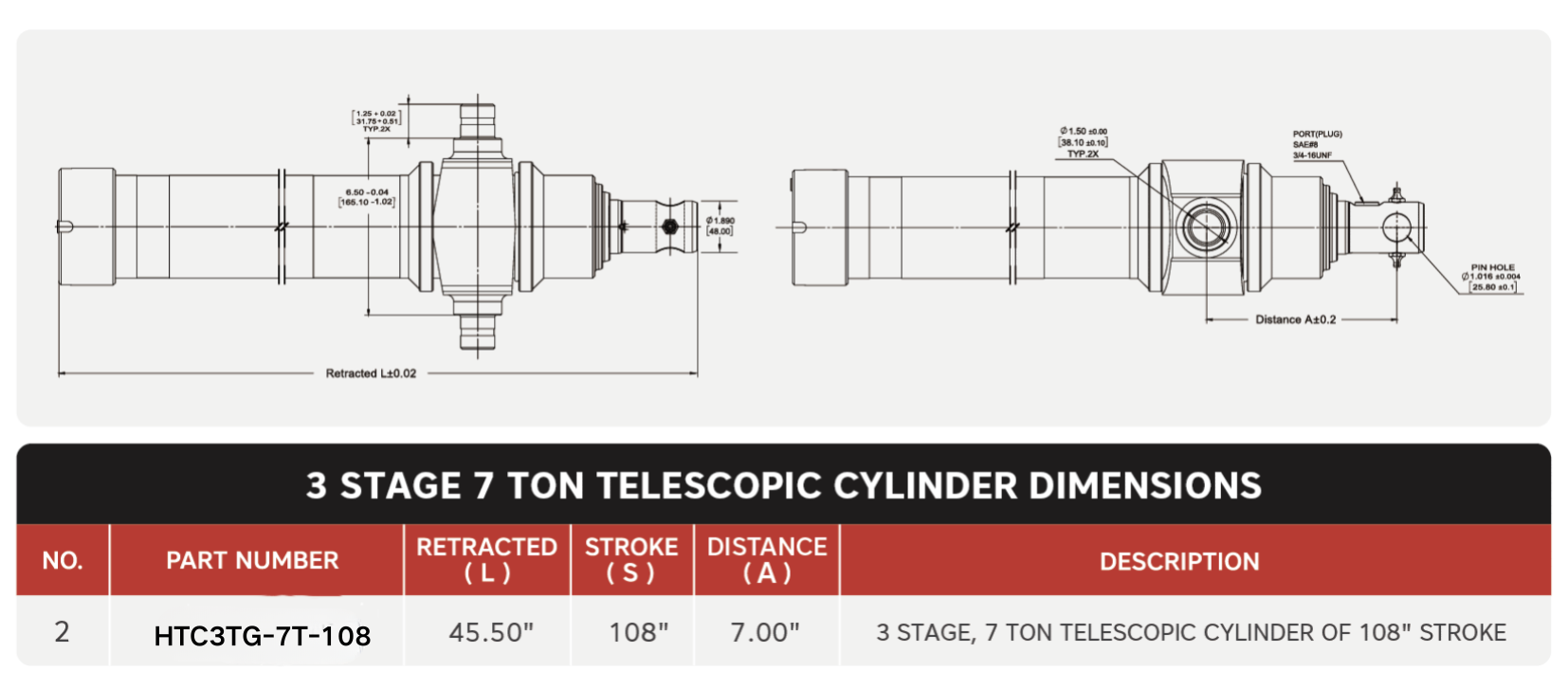 "HTC3TG-7T-108", 3 pakopų, 7 tonos 108 colių eigos teleskopiniai cilindrai