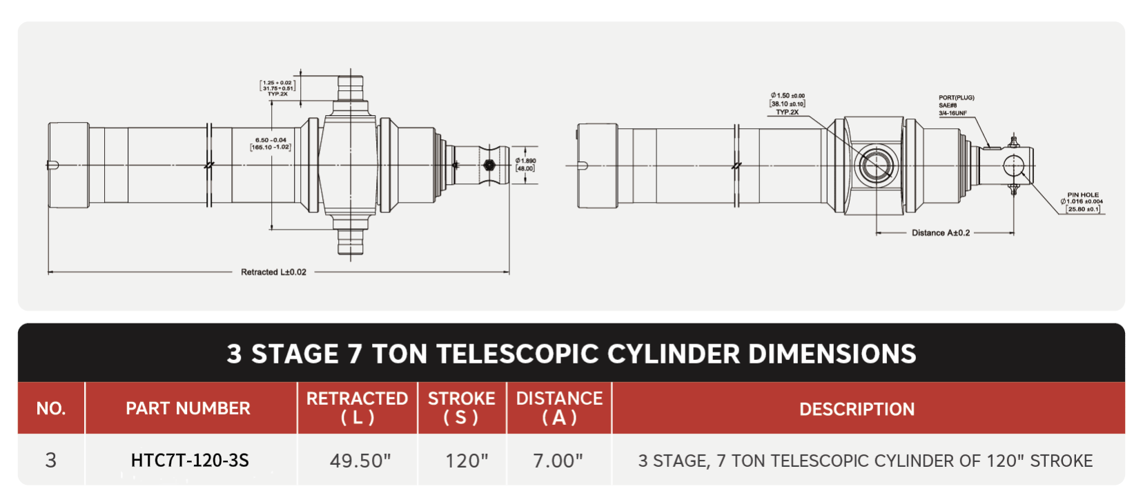 „HTC3TG-7T-120“, 3 pakopų, 7 tonos 120 colių eigos teleskopiniai cilindrai